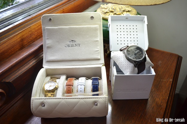 Nossos presentes de cinco anos de casados: Relógio Oriente com quatro pulseiras (Bru comprou no Brasil) e Relógio da Diesel (comprei no Uruguai)