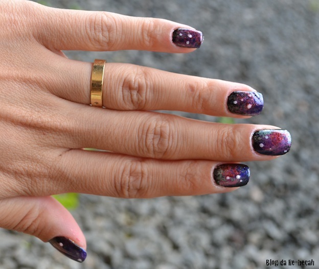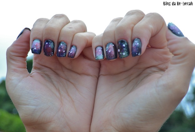 Em todas as unhas esmaltei com uma camada fina e depois duas camadas apenas nas pontas. Por ser glitter, fiz com o pincel mesmo e não com esponja.
